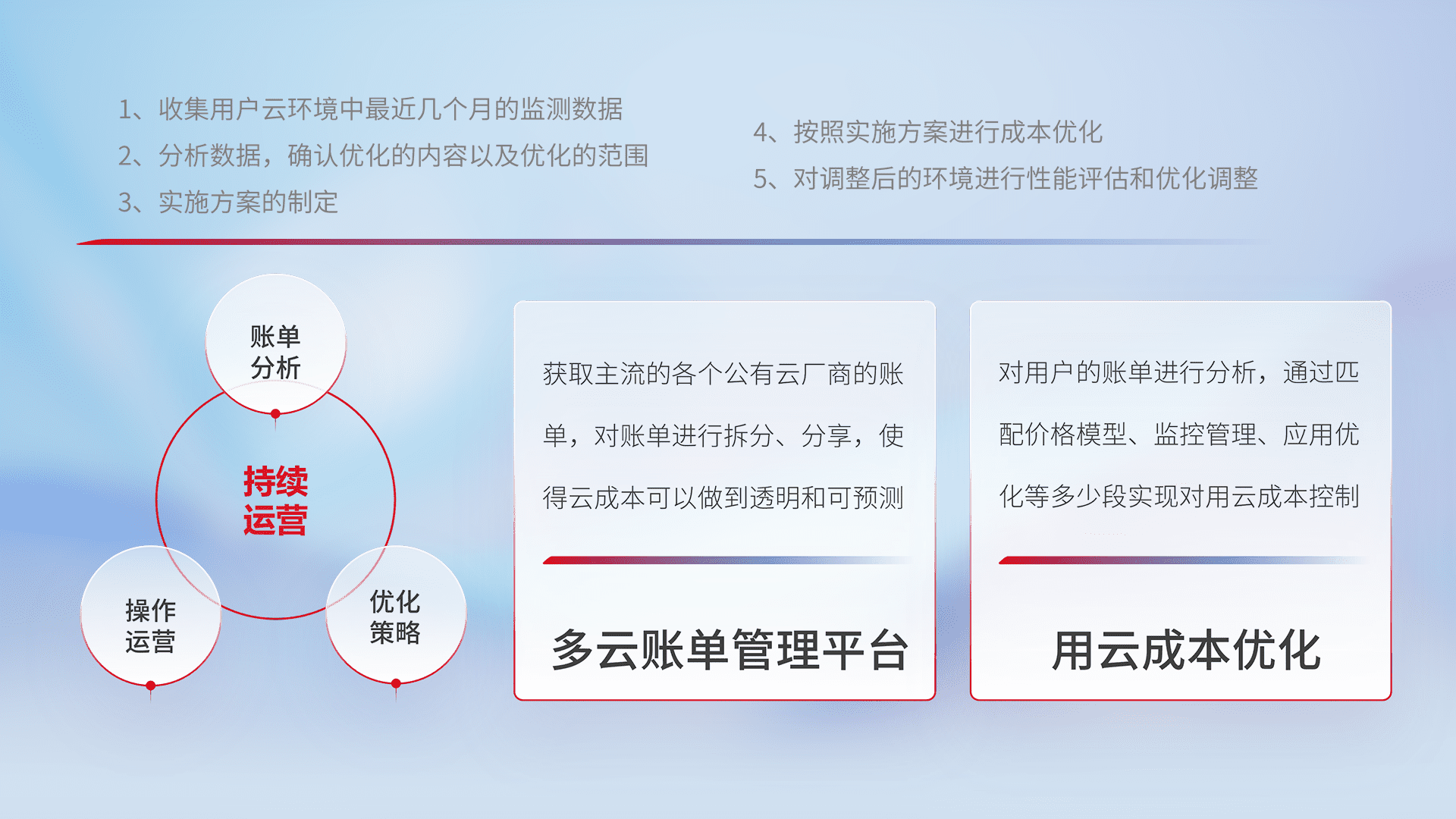通过多云纳管,,以统一的资源数据模型把客户的云资源进行抽象和封装,,进而实现对多云资源的统一操作,,保障云资源管理的可靠性、、、、稳定性与可用性。。。量身定制化运维内容,,配置、、、开发运维、、补丁管理、、备份、、监控、、、认证和访问管理、、、审计和日常巡检等,,保障在用云过程中的可靠度,,,稳定度以及高可用率。。。